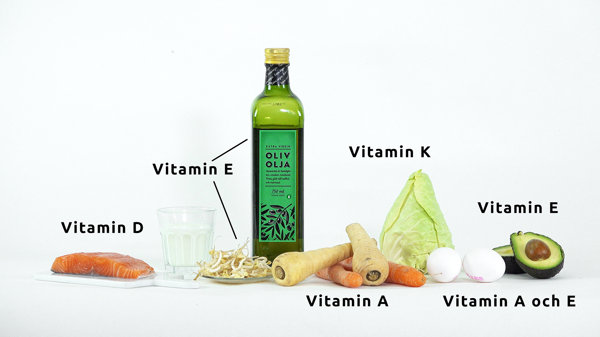 Om vi har ett överskott av fettlösliga vitaminer så kan de lagras i kroppen. De kan lagras i levern eller i fettet. Det innebär också att det inte är så lätt för kroppen att göra sig av med ett överskott, om vi skulle råka få i oss för mycket. Därför kan till exempel A-vitamin vara skadligt i för stora doser. Det är lättare att bli av med vattenlösliga ämnen. Vi kissar helt enkelt ut dem. Du behöver inte vara rädd för att få i dig för mycket vitamin om du äter vanlig mat. Du ska dock vara försiktig med att äta större doser av vitaminer som kosttillskott än vad som rekommenderas. De fettlösliga vitaminerna tas upp från maten när de kommer ner till tunntarmen. För detta krävs galla. Galla är en kroppsvätska som bildas i levern och som släpps ut i tunntarmen. Kroppen använder också galla för att lösa upp fett. Personer som lider av vissa leversjukdomar kan därför få vitaminbrist trots att maten de äter innehåller tillräckligt med vitaminer. Vitamin K är bland annat viktigt för att blodet ska kunna levra sig om du får ett sår och blöder. Eftersom det är så viktigt erbjuds alla nyfödda en spruta med K-vitamin strax efter födseln. Personer som har en ökad risk att få blodpropp kan däremot behöva ta läkemedel som hämmar vitamin K. Den största produktionen av D-vitamin bildas från kolesterol när solljus träffar huden. Det är därför viktigt att vi vistas ute regelbundet under sommarmånaderna. Som tur är kan vi lagra stora mängder D-vitamin i levern. De lagrade D-vitaminerna kan sedan användas under årets mörka månader. Det finns också D-vitamin i viss mat, till exempel fet fisk. Därför rekommenderas att vi äter fisk tre gånger i veckan. D-vitamin tillsätts ofta också till mjölkprodukter. D-vitamin är viktigt för att skelettet ska få en bra kalkbalans och bli starkt. Om vi har mörk hudfärg, bär heltäckande klädsel eller är inomhus större delen av den ljusa årstiden kan vi faktiskt också riskera att drabbas av brist på D-vitamin. Då måste vi äta kosttillskott. Mörk hudfärg, liksom kläder filtrerar solljuset och leder till att det bildas mindre D-vitamin i huden. Vattenlösliga vitaminer lagras oftast inte i kroppen