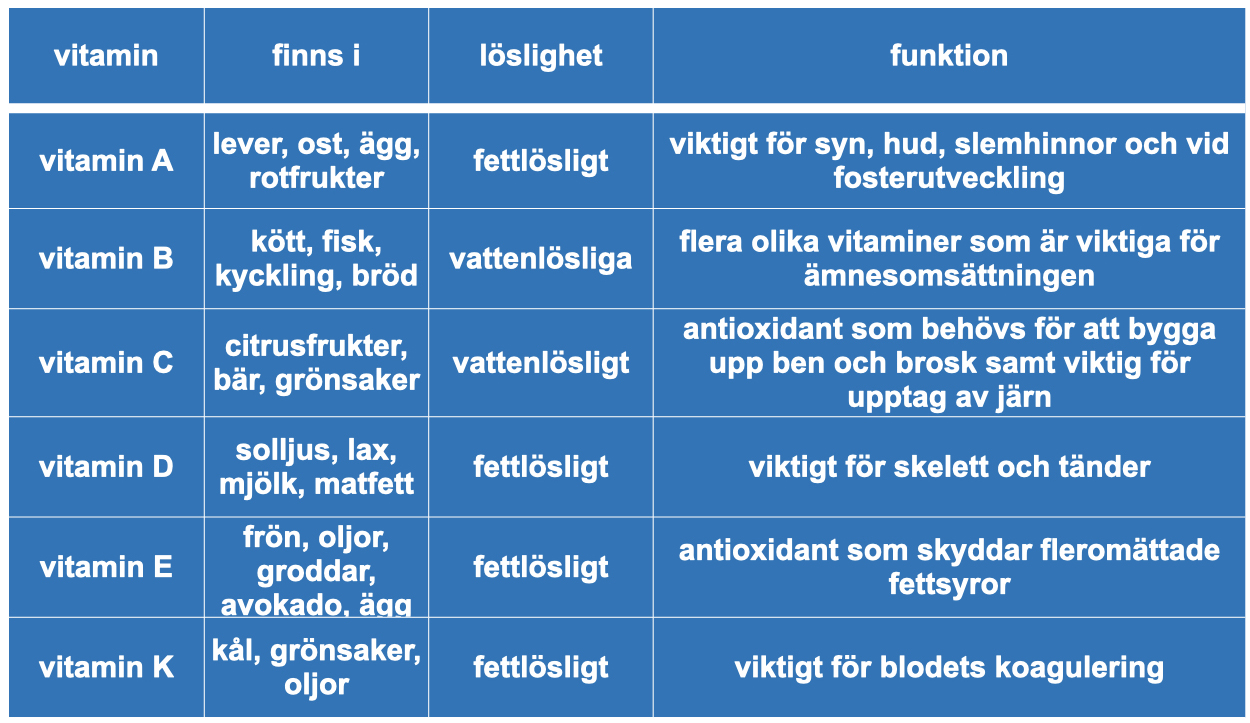 Vitaminer är fettlösliga eller vattenlösligaVitaminer är organiska ämnen som är nödvändiga för oss i små mängder. Ordet vitaminer kommer från latinets vita, som betyder liv, och amin som är en grupp av kemiska ämnen. Vitaminer kan inte bildas i tillräckligt stor mängd i kroppen. Vi måste därför få i oss dem via maten vi äter. Mängden vi behöver varierar mellan olika vitaminer. Eftersom vitaminerna har specifika funktioner i kroppen kommer det märkas ifall vi inte får i oss tillräckligt. Vitaminbrist leder till olika bristsjukdomar. Allvarliga fall av vitaminbrist kan vara livshotande. Det är inte bara brist på vitaminer som är farligt. Vissa vitaminer kan även vara skadliga om vi får i oss för mycket av dem. Vitaminer delas in i fettlösliga och vattenlösliga. De fettlösliga vitaminerna är vitamin A, D, E och K. De vattenlösliga är de olika B-vitaminerna och C-vitamin. Totalt finns det 13 vitaminer. Det är den kemiska strukturen som avgör om ett visst vitamin är fettlösligt eller vattenlösligt.