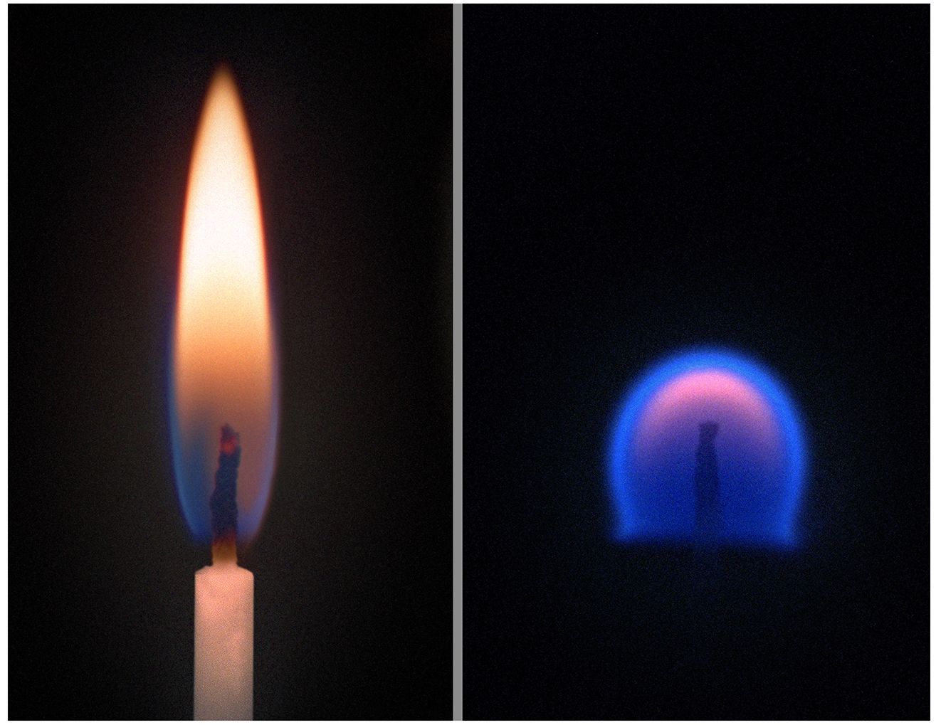 När elden brinner rör sig de varma rökgaserna uppåt. Varma gaser har lägre densitet än kalla gaser. Det gör att lågorna strävar uppåt. I rymdstationen finns ju inget upp eller ner och de varma gaserna sprids lika mycket åt alla håll. Det innebär att en ljuslåga i tyngdlöst tillstånd blir klotrund. Ett annat fenomen som blir annorlunda i tyngdlöst tillstånd är tillförseln av syre. Vi är vana vid att de varma gaserna strävar uppåt. Då lämnar de ett tomrum som fylls med luft från omgivningen. På så sätt tillförs hela tiden ny syrgas. I tyngdlöst tillstånd sker inte detta och om inget nytt syre tillförs slocknar så småningom lågan.