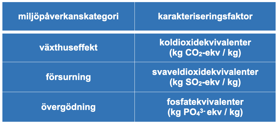 Steg 1 – Mål och omfattningDet första steget inleds med att bestämma målet med livscykelanalysen. Det gäller att besvara frågor som varför studien görs, vem den vänder sig till och hur resultaten skall användas. Här anges också vilka avgränsningar som krävs och vilka antaganden som måste göras. I vårt exempel med påsarna kan frågeställningen vara att ta reda på om plastkassen eller papperskassen är det bästa valet ur miljösynpunkt. Ett antagande kan vara att trycket på plastkassen eller papperskassen ger samma miljöpåverkan oberoende av vilken typ av påse det är. En avgränsning kan vara att bara titta på svenskproducerade påsar. I en livscykelanalys värderas all miljöbelastning per funktionell enhet. Den funktionella enheten är ett mått på den ”nytta” som den studerade produkten levererar. Detta måste bestämmas innan analysen kan göras. I exemplet med plastkasse och papperskassen kan den funktionella enheten vara att bära hem en viss mängd matvaror från affären. En papperskasse är ju till exempel oftast större än en plastkasse. Ett annat exempel kan vara att analysera miljöbelastningen för olika sätt att producera el. Då kan den funktionella enheten vara 1 kWh elenergi. Om syftet är att jämföra olika typer av färg kan den funktionella enheten vara kvadratmeter målad yta. I det första steget bestäms också var och hur studien ska avgränsas. Oftast görs en livscykelanalys från ”vagga till grav”, det vill säga från utvinningen av råvarorna från naturen tills att de inte längre används av människor utan lämnar systemet i form av avgaser eller avfall. Dessutom bestäms för vilket geografiskt område och för vilken tidsperiod som livscykelanalysen gäller. Produkter tillverkas på olika sätt i olika delar av världen och olika platser är olika känsliga för utsläpp som påverkar miljön. Ofta produceras flera olika produkter i samma process, samtidigt som den förbrukar resurser och leder till utsläpp. Ett exempel är ett kraftvärmeverk som producerar både el och värme. Det är då inte självklart hur användningen av resurser och utsläpp ska fördelas mellan de olika produkterna som producerats. Denna fördelning kallas för allokering. Det går att allokera resurser antingen efter fysiska samband eller utifrån det ekonomiska värdet. Ett fysiskt samband kan vara massa eller energiinnehåll. Vid tillverkning av plastpåsar behöver allokering göras i oljeraffinaderiet där flera olika produkter produceras samtidigt som råvarorna till plastpåsen. Steg 2 - InventeringsanalysI inventeringsanalysen kartläggs allt material och all energi som används under produktens livscykel. Vad är det som behövs och hur mycket? När detta är klart gäller det att samla in information om vilken miljöpåverkan detta har. För att få fram tillförlitlig information används databaser som innehåller uppgifter om ett stort antal processer och olika produkters miljöpåverkan. Även information om miljöpåverkan från transporter och drivmedel är enkelt att få fram. Steg 3 - MiljöpåverkansbedömningEfter inventeringsanalysen finns en stor mängd information insamlad kring alla utsläpp som en produkt ger upphov till och hur mycket resurser den förbrukar. Det kan vara ganska svårt att bedöma vilken information som är viktig ur miljösynpunkt och som bidrar mest till produktens miljöpåverkan. Först sorteras informationen utifrån vilken typ av miljöpåverkan det gäller. Några exempel är försurning, övergödning och växthuseffekt. Denna indelning är baserad på naturvetenskapliga samband. Vi vet till exempel att koldioxid bidrar till den ökande växthuseffekten. Denna sortering kallas för klassificering. Efter klassificeringen görs en karakterisering. Det innebär att alla utsläpp som har en viss miljöpåverkan räknas om med hjälp av en karakteriseringsfaktor. För påverkan på växthuseffekten jämförs alla utsläpp av växthusgaser med koldioxid. Koldioxid har karakteriseringsfaktorn 1. Alla utsläpp som påverkar växthuseffekten räknas då om till koldioxidekvivalenter med hjälp av sin karakteriseringsfaktor. Olika växthusgaser påverkar växthuseffekten olika mycket. Ett exempel är metan som har ungefär 25 gånger starkare påverkan på växthuseffekten jämfört med koldioxid. Det betyder att ett kilogram metan påverkar klimatet 25 gånger mer än ett kilogram koldioxid. Därför multipliceras utsläppen av metan med 25. På samma vis mäts försurning som kilogram svaveldioxidekvivalenter. Svaveldioxid är en gas som leder till försurning. Övergödning mäts som kilogram fosfatekvivalenter. Fosfatjoner leder till övergödning.