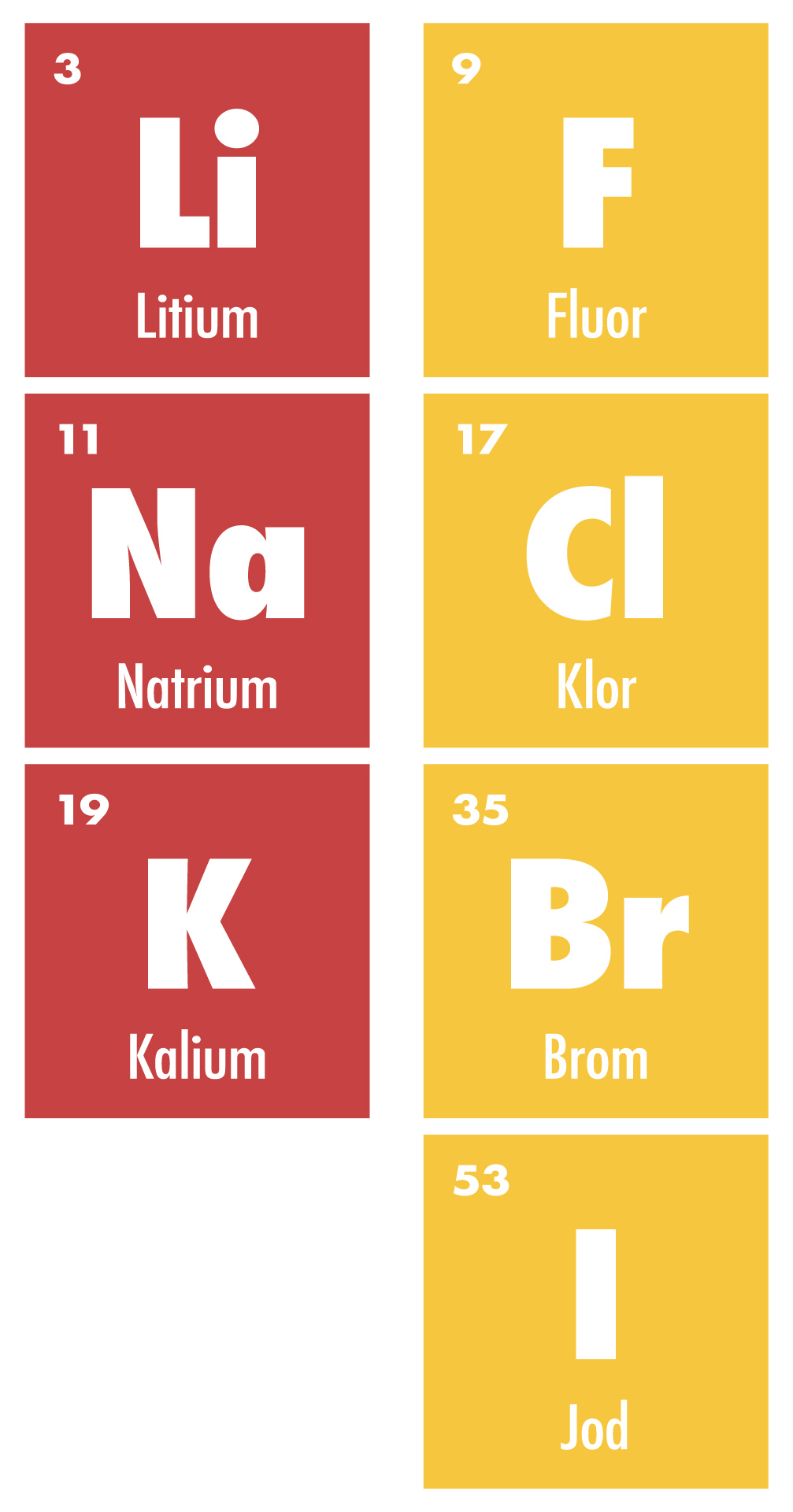 De grundämnen som står längst till vänster i periodiska systemet kallas för alkalimetaller. De har bara en elektron i sitt yttre s-skal. Genom att lämna ifrån sig den elektronen så får de ett fyllt yttre p-skal. Natrium kan lämna ifrån sig en elektron och blir då en positivt laddad natriumjon, Na+. Kalcium, som har två elektroner i sitt yttre s-skal kan lämna ifrån sig båda och blir Ca2+.