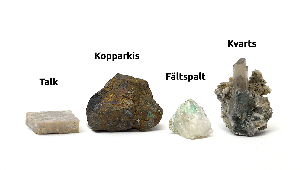Island blir 4 cm bredare varje år. Samtidigt pressas Indien ned under Himalaya och kommer så småningom att försvinna. Det är vår jordskorpa som konstant ombildas och förbrukas. På de ställen på jordklotet där detta sker är det vanligt med vulkaner och jordbävningar. En vulkan kan vara explosiv och spy ut gaser, aska och trögflytande lava. Den kan också ha ett lugnare utbrott med lättflytande lava. Det beror på om lavan kommer från en del av jordskorpan som innehåller mycket eller lite av atomslaget kisel (Si). Jordskorpan består till största delen av syre (O), kisel (Si), aluminium (Al), järn (Fe), kalcium (Ca), natrium (Na), kalium (K) och magnesium (Mg) och därför är dessa också våra vanligaste atomslag. Jordskorpan innehåller också små mängder av basmetallerna koppar (Cu), zink (Zn) och bly (Pb). Basmetaller är sådana som används mycket i samhället. Dessutom finns mycket små mängder av metaller som kobolt (Co) och neodym (Nd). Dessa kallas sällsynta eller kritiska metaller. Det är just dessa metaller som behövs till våra mobiltelefoner, läsplattor, vindkraftverk och solcellspaneler. De sällsynta metallerna ligger i berggrunden som nålar i en höstack. Det gäller alltså att hitta och plocka ut dem. Jordens kemiska byggstenar kallas mineralEndast 12 atomslag förekommer i jordskorpan i koncentrationer högre än 0,1 viktprocent. Dessa 12 atomslag utgör 99 % av jordskorpans massa och ingår i de 30 vanligaste mineralen. Ett mineral är ett oorganiskt fast material. Det har en specifik kemisk sammansättning och kristallstruktur och är naturligt bildat. Det har dessutom bestämda egenskaper, till exempel densitet. Ungefär 5000 mineral har hittills hittats i världen. De flesta mineral är föreningar som innehåller fler än ett atomslag, men det finns också mineral som är rena grundämnen, till exempel diamant och grafit som båda består av atomslaget kol. Många av egenskaperna hos mineral beror på dess kristallstruktur och kemiska sammansättning. Mineral med jonbindningar och kovalenta bindningar är starka och hårda. Diamant är ett av de hårdaste mineral vi känner till. Mineral med svagare bindningar är betydligt mjukare. Talk består av tunna skikt som hålls ihop av svaga bindningar. Det är ett av de mjukaste mineral som finns. Det kan enkelt repas med nageln.