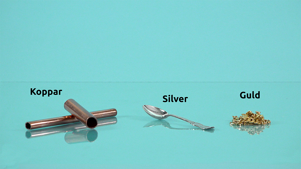 I vanliga sladdar, till exempel en laddsladd till mobilen, använder vi koppar (Cu). Koppar leder elektrisk ström väldigt bra. Koppar reagerar heller inte särskilt snabbt med luftens syrgas (O2). Det ser vi genom att kopparn i sladdar är blank en lång stund efter att vi har skalat av den isolerande plasten runt koppartrådarna. Koppar är visserligen dyrt, men ändå mycket billigare än silver (Ag). Silver är den bästa elektriska ledaren. Silver och guld används som ledare i en del elektronik - till exempel mobiltelefoner. I andra metaller, som till exempel järn (Fe), rör sig elektronerna med mycket mera motstånd. Då blir metallen varm. Det skulle kunna starta en brand. Järn bildar dessutom en oxid betydligt enklare än koppar. Metalloxider är mycket dåliga elektriska ledare. Metaller kan vara mjuka eller hårdaAtt alla valenselektroner delas mellan alla atomer i metallkristallen förklarar också varför vi kan forma metaller. En tråd av metall är lätt att böja. Större stycken av metall kan vi forma genom att först värma dem och därefter slå på dem med en hammare. Det som händer när vi formar metallen är att atomerna flyttar sig i kristallen. Eftersom atomerna i metallkristallen delar på elektronerna, kan atomerna röra sig utan att behöva bryta och bilda bindningar till varandra.