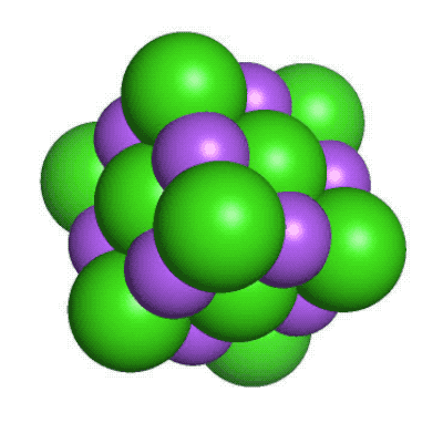 En liten del av en kristall med natriumklorid. Natriumjonerna är lila medan kloridjonerna är gröna. Det går att tillverka nya grundämnenFör att förstå hur protonerna i atomkärnan stöter bort varandra och hur neutroner hjälper till att hålla samman kärnan så skapar forskarna nya atomer och isotoper. Speciellt spännande blir det när man gör atomkärnor som har fler protoner än andra kända grundämnen. Då är det nämligen frågan om ett nytt grundämne som efter grundliga utvärderingar kanske kan få ta plats i det periodiska systemet. Ett exempel på ett sådant nytt syntetiskt grundämne är californium (Cf med atomnummer 98). Det framställdes första gången 1950 av svenskättlingen och kemisten Glenn Seaborg och hans medarbetare i Berkeley, Kalifornien. Sedan dess har vi fått många nya grundämnen, bland dessa seaborgium (Sg med atomnummer 106). De nya grundämnena tillverkas genom att låta två lättare atomer kollidera med varandra med stor kraft. Med lite tur så slås de då ihop till en ny slags atom. Det är inte ofta detta sker, så forskarna får ha både tur och rejält med tålamod. Ibland kan det ta veckor eller månader att bilda en enda atom. Men varje gång det lyckas får vi en ny pusselbit i vår förståelse för hur atomkärnan sitter ihop.