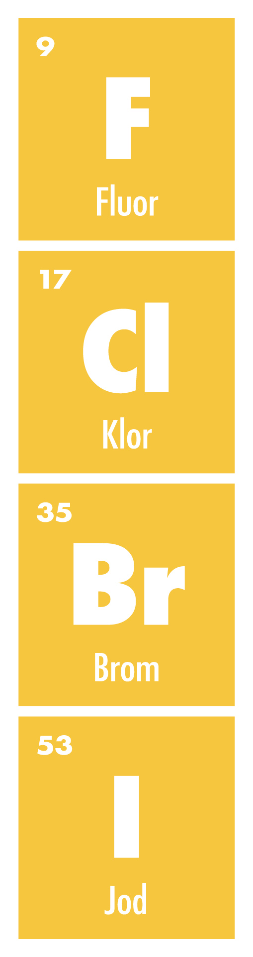 Ordnar vi korten i en kortlek från ett (ess) till tretton (kung) för klöver och sedan börjar om med ruter i raden under, hjärter sedan och sist spader, så får vi tretton kolumner och fyra rader. Alla fyrorna ligger nu i samma kolumn. Kemisterna kallar kolumnerna i det periodiska systemet för ”grupper”. Alla kort i samma kolumn har samma egenskap, de är värda 4, men har olika ”färg”. Halogener tar gärna upp en extra elektron