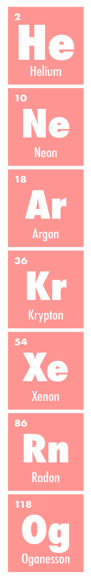 Sist i kolumnen hittar vi det syntetiskt framställda oganesson (Og). Det är just nu det sista grundämnet och har nummer 118 i det periodiska systemet. Däremellan kommer neon (Ne) som finns i neonskyltar, argon (Ar) som används som isolering i flerglasfönster, krypton (Kr) och xenon (Xe) som också används för att skapa ljus på olika sätt. Sist av de naturligt förekommande ädelgaserna hittar vi radon, som är radioaktiv. Ädelgaserna reagerar ogärna med andra ämnen och inte ens med sig själva. I en heliumballong finns alltså bara enskilda heliumatomer, inga molekyler. Det är därför de kallas ”ädla”. Ett mer kemiskt uttryck är inerta. Inert betyder att de inte gärna reagerar med andra ämnen. Det är dock inte helt sant. Ju längre nedåt vi rör oss i ädelgasgruppen desto mer reaktiva blir ädelgaserna. De är fortfarande ganska oreaktiva i jämförelse med andra grundämnen. Hur ädelgasernas egenskaper förändras när vi rör oss nedåt i gruppen ger oss också en ledning till hur det står till i andra grupper. Liknande gradvisa ändringar av egenskaper kan vi se i alla grupper. Det går därför inte att anta att grundämnena beter sig exakt lika bara för att vi hittar dem i samma grupp.