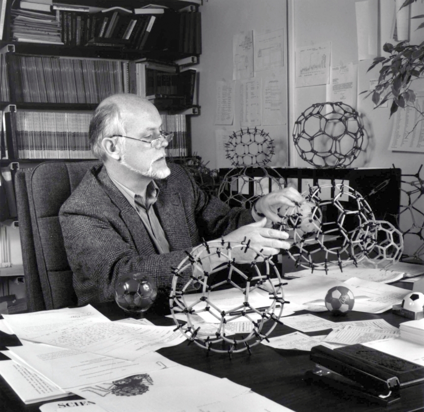 Richard E. SmalleyNobelpris i kemi 1996: "för deras upptäckt av fullerener" Richard E. Smalley (1943-2005) föddes i Ohio, USA. Grundämnet kol kan anta en rad olika former. I naturen finns det till exempel som grafit och diamant. Robert Curl, Harold Kroto och Richard Smalley bestrålade 1985 en yta av grafit med laserpulser så att kolgas bildades. När kolgasen kondenserade bildades tidigare okända strukturer med 60 respektive 70 kolatomer. Den vanligaste strukturen hade 60 kolatomer ordnade i ett klot uppbyggt av fem- och sexkanter. Strukturerna kallades "fullerener" efter arkitekten Buckminister Fuller som arbetat med denna geometriska form.
